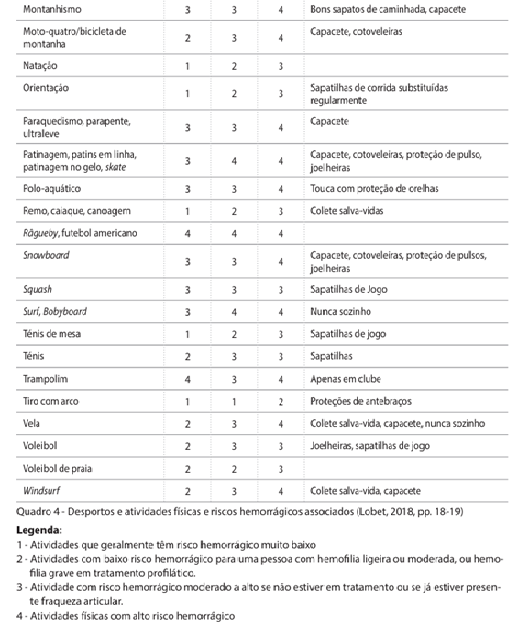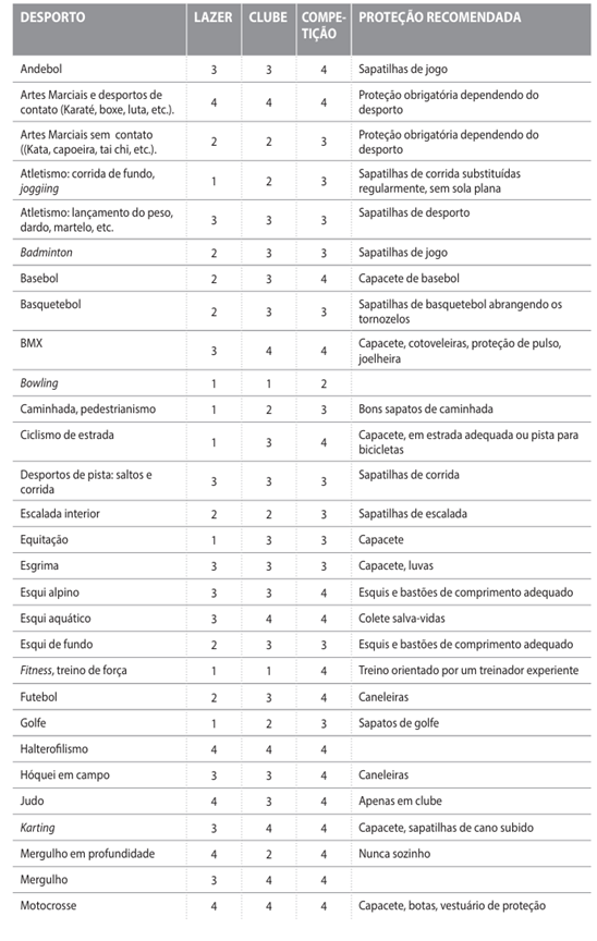 Quadro – Desportos e atividades físicas e riscos hemorrágicos associados